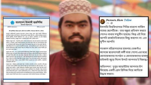 ইবি প্রতিনিধি : বাংলাদেশ জাতীয়তাবাদী ছাত্রদলের যুগ্ম সাধারণ সম্পাদক মানসুরা আলমের ‘সাজিদ হত্যাকাণ্ডে ছাত্রশিবিরকে জড়ানোর’ বক্তব্যকে সুস্পষ্ট মিথ্যাচার ও রাজনৈতিক উদ্দেশ্যপ্রণোদিত বলে তীব্র নিন্দা জানিয়েছে ইসলামী বিশ্ববিদ্যালয় শাখা ছাত্রশিবির। বৃহস্পতিবার (১১